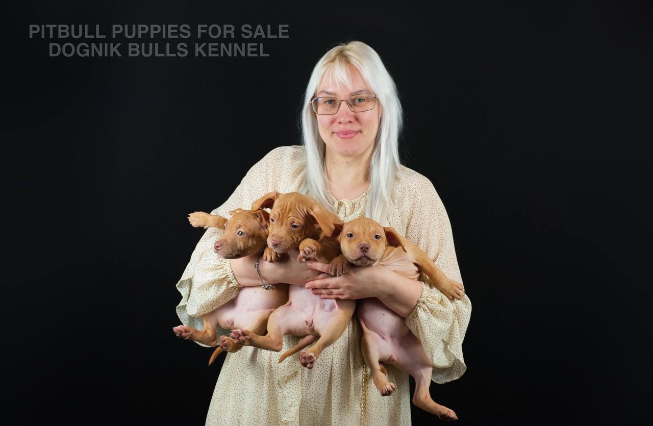 Multiple red nose Pitbull puppies from Dognik Bulls Kennel are shown together in the breeder’s arms. This litter features excellent red pigmentation, correct head types, and stable temperaments. Perfect for homes wanting a purebred, well-socialized Pitbull puppy.